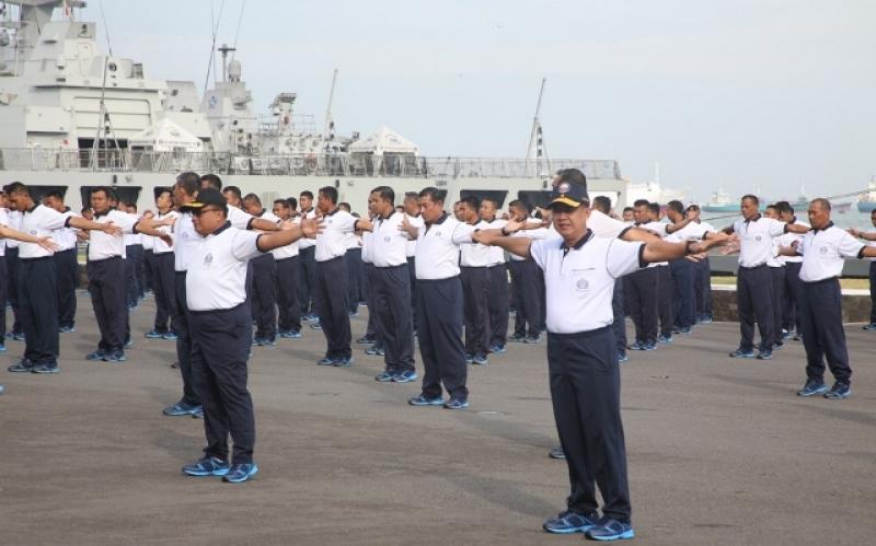 OLAHRAGA -- Kasarmatim Laksma TNI Sudihartawan, SPi., MM., mengajak olahraga bersama di Dermaga Madura Koarmatim, Ujung, Surabaya, akhir pekan lalu.