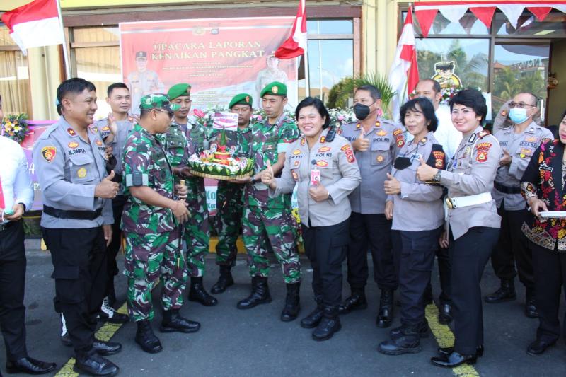balitribune.co.id | Badung – Kapolres Kawasan Bandara I Gusti Ngurah Rai AKBP Ida Ayu Wikarniti, S.E. bersama jajarannya tidak menduga mendapat kejutan di Hari Bhayangkara Ke-76, mendapat kunjungan dari Komandan Pangkalan TNI AU (Danlanud) I Gusti Ngurah Rai Kolonel Pnb. Putu Sucahyadi bersama puluhan anggotanya dan juga Komandan Kodim 1611/Badung Kolonel Inf. Dody Triyo Hadi, S.Sos., M.Si. juga bersama anggota, jumat (1/7).