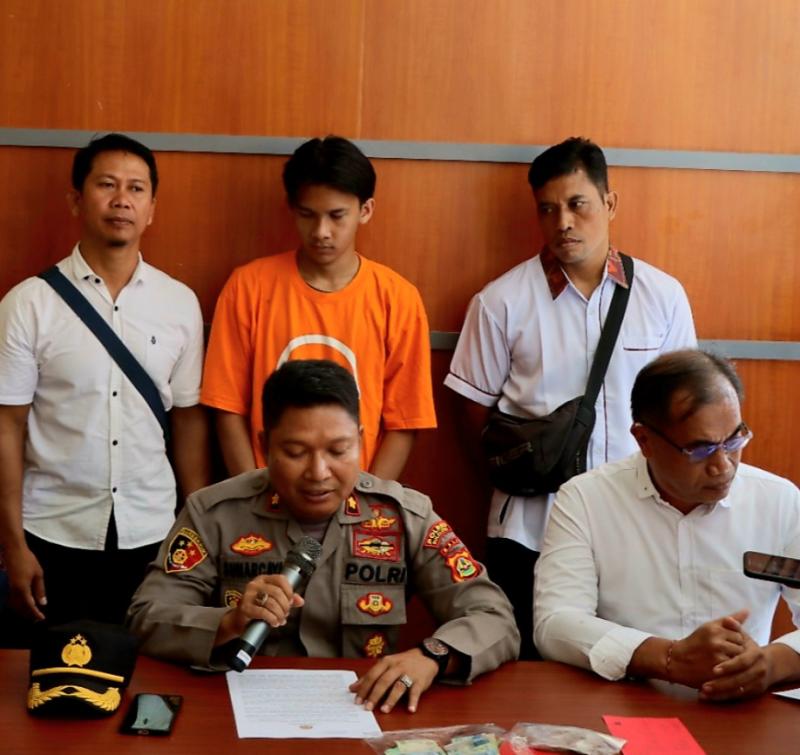 Bali Tribune/ TUNJUKKAN - Pelaku pencurian kotak sesari di Pura Gede Desa Pengastulan I Ketut Yudha Sanjaya diperlihatkan saat jumpa pers, Senin (25/3/2024).