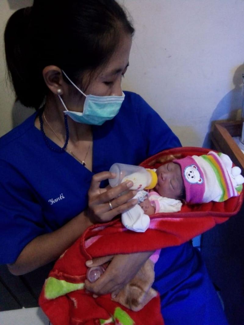 Bali Tribune/ seorang wanita memberikan susu formula terhadap Bayi yang ditemukan.
