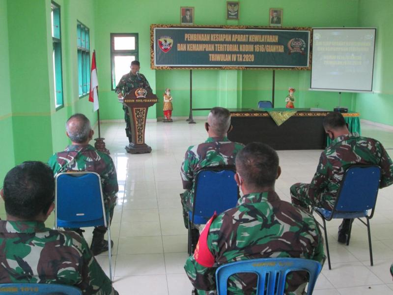 Balitribune.co.id | Gianyar - Kodim 1616/ Gianyar melaksanakan kegiatan Pembinaan Kesiapan Aparat Kewilayahan (Binsiap Apwil) dan Kemampuan Teritorial (Puanter) triwulan IV tahun 2020, di Aula TNI Manunggal Rakyat Kodim 1616/Gianyar, Selasa (3/11).  Kegiatan ini dimaksudkan untuk meningkatkan kesiapan prajurit dalam pelaksanaan pembinaan dan pemerdayaan wilayah pertahanan di darat