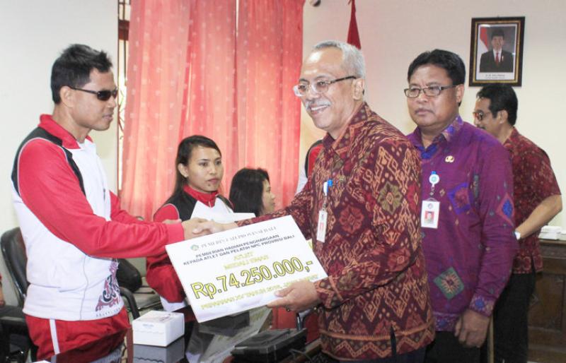 PENGHARGAAN – Atlet Bali yang turun di Peparnas XIX Jawa Barat 2016 lalu mendapat penghargaan dari Pemprov Bali.