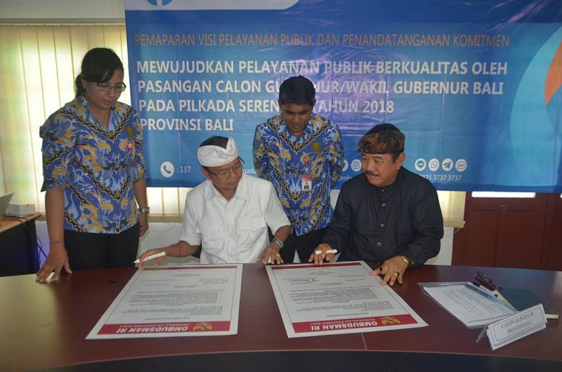 PAKTA INTEGRITAS – calon gubernur dan calon wakil gubernur Bali nomor urut 1, Koster-Ace menandatangani pakta integritas pelayanan publik berkualitas disaksikan Kepala ORI Bali, Umar Ibnu Alkhatab.