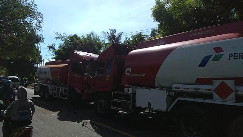 Bali Tribune/ MACET - Kecelakaan dua mobil Tangki BBM sebabkan kemacetan.