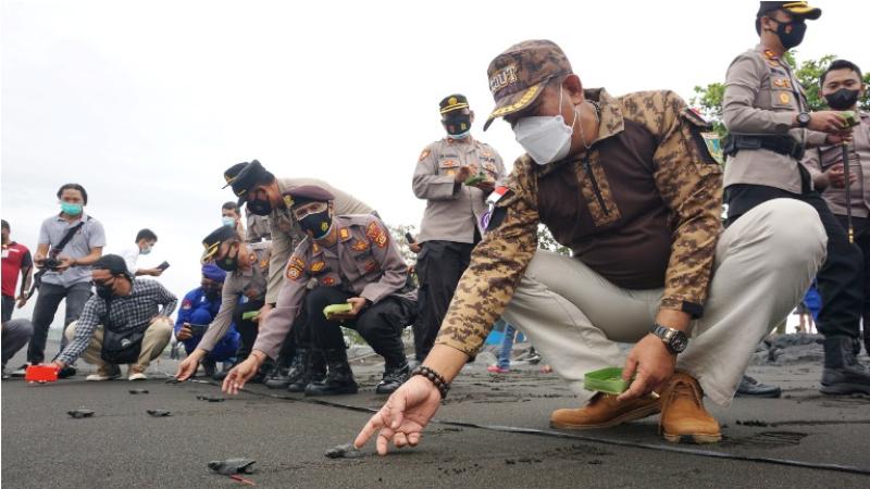 balitribune.co.id | Semarapura  - Kelestarian budidaya tukik atau anak penyu harus dijaga bersama dengan sebaik-baiknya, jangan biarkan keberadaan mereka sampai punah. Hal itu disampaikan saat Wakil Bupati Klungkung I Made Kasta bersama Kapolres Klungkung AKBP I Made Dhanuardana, S.I.K., M.H. melepas 200 ekor tukik di Pantai Klotok, Kabupaten Klungkung, Jumat (25/6/21).