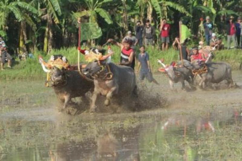BALI TRIBUNE - Selain atraksi Makepung Cikar, Jembrana juga memiliki atraksi Makepung Lampit. Makepung Lampit yang atraksinya dilakukan diareal sawah berlumpur ini memiliki keunikan dan daya tarik tersendiri. Bahkan sejak empat tahun terkahir, tadisi Makepung Lampit yang merupakan tradisi masyarakat agraris di Bali Barat ini mulai rutin dilombakan setiap tahunnya. Tahun ini Lomba Makepung Lampit yang dilaksanakan Minggu (25/11) pagi di Sirkuit Makepung Lampit, Banjar Peh, Desa Kaliakah, Kecamatan Negara diikiti puluhan pasang kerbau. Di tengah berbagai tantangan, dampak kemajuan jaman terhadap pertanian di pedesaan, Masyarakat agraris di Jembrana selama ini masih tetap melestarikan tradisi Makepung Lampit. Pengurus Sekha Makepung Jembrana, Kade Nuraga (53) mengatakan atraksi Makepung Lampit ini merupakan budaya lokal Jembrana yang diwariskan secara turun temurun, “ini tradisi turun menurun dari tetua kami dulu” ujar warga Banjar Banyubiru, Negara ini. Menurutnya makepung lampit memiliki perbedaan dengan makepung cikar, “makepung cikar dilakukan dilintasan kering, sedangkan makepung lampit dilakukan disawah berair dan berlumpur” jelasnya. Dituturkannya, Makepung Lampit ini dulunya berawal dari aktifitas membajak sawah (ngelampit) yang bernafaskan budaya gotong royong dan semangat berkompetisi. “Dari penuturan tetua kami, dulunya makepung lampit ini berawal dari aktiftas petani membajak sawah, saat itu dilakukan bersama secara bergotong royong menjelang musim tanam padi. Sama seperti makepung cikar tapi ini dilakukan sebelum musim tanam padi, ide awalnya sederhana yakni untuk memacu semangat ditengah sawah, para petani kejar-kejaran (balapan) menggunakan bajak dan akhirnya menjadi tradisi dan atraksi” tuturnya. Bahkan menurutnya untuk atraksi makepung lampit memiliki keunikan tersendiri. “Kalau makepung lampit ini harus dilaksanakan diareal persawahan berair dan berlumpur, tapi lumpurnya juga tidak boleh dalam, sehingga pemilihan tempatnya harus benar-benar tepat. Kalau tahun lalu di Kaliakah dan sekarang di Peh” jelasnya. Menurutnya petakan swah harus memiliki panjang minimal 80 meter dengan lebar minimal 20 meter serta kedalam lumpur 10 cm , “ini yang sulit karena sawah sekarang petakannya sempit-sempit dan lumpurnya dalam” ungkapnya. Bahkan menurutnya tidak semua kerbau bisa berlari dilumpur sehingga hanya kerbau yang sudah terlatih saja yang bisa digunakan mekepung lampit. Makepung lampit juga mempergunakan peralatan yang kini sudah langka. Selain tidak menggunakan pemukul rotan berduri seperti pada makepung cikar pada umumnya dan hanya memakai pecut untuk memacu kerbau berlari kencang sehingga kerbau tidak terluka, perlengkapan pada makepung lampit juga diakuinya kini sudah sangat terbatas.  “Kami menggunakan lampit (bajak). Alat-alanya sekarang sudah jarang dimiliki akibat digantikannya lampit dengan mesin traktor. Sejak empat tahun dilombakan, kami baru buat dan kembali dikembangka” paparnya. Keterbatasan alat ini juga berpengaruh pada perserta makepung lampir. “Tahun ini ada 34 peserta dibagi tiga kategori yakni grup A untuk ukuran kerbau besar, grup B untuk yang sedang dan  grup C yang kecil” tandasnya. Kepala Dinas Pariwisata dan Kebudayaan (Parbud) Kabupaten Jembrana, I Nengah Alit didampingi Kepala Bidang Pariwisata, I Nyoman Wenten menyatakan atraksi makepung lampit ini menggambarkan kegembiraan petani dalam membajak sawahnya. Makepung Lampit menurutnya memiliki daya tarik tersendiri, “Ini memiliki keunikan tersendiri dan sensasinya beda. Ada ciptratan lumpur saat kerbau berpacu sehingga menarik diabadikan oleh para fotografer” ujarnya. Bahkan untuk melestarikan tradisi yang menarik wisatawan ini, kini Pemkab Jembrana setiap tahun rutin menggelar Lomba Makepung Lampit, “Lomba Makepung Lampit juga menjadi event wisata di Jembrana” tandasnya.