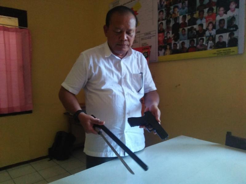 BB - Polisi memperlihatkan barang bukti berupa samurai dan pistol setelah menangkap pelaku pengeroyokan terhadap Caesar Putra di Pantai Penimbangan Singaraja.