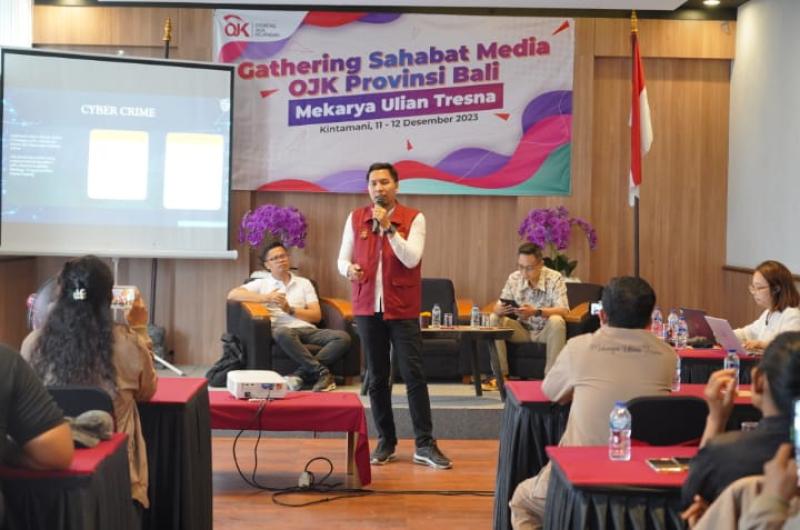 Bali Tribune / GATHERING - AKP I Made Martadi Putra, Kanit 4 Subdit V Ditreskrimsus Polda Bali, dalam acara Media Gathering yang diadakan Otoritas Jasa Keuangan (OJK) Provinsi Bali pada Senin (11/12) di Kintamani, Bangli.