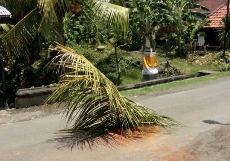 Bali Tribune/KELAPA - Jalan berlubang di Banjar Kelepekan, Desa Tumbak Bayuh ditanami pelepah pohon kelapa oleh warga setempat.