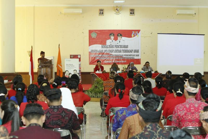 Sosialisasi yang dilaksanakan di Gedung Kesenian DR Ir Soekarno Jembrana ini  dibuka oleh Sekda Jembrana, I Made Sudiada. Kepala Dinas PPPA-PPKB Jembrana, Ni Kade Ari Sugianti dalam laporannya yang dibacakan Sekretaris Dinas PPPA-PPKB Jembrana, Ni Ketut Suwitri mengatakan tujuan dilaksanakan acara ini adalah untuk memberikan pemahaman kepada Anggota Gabungan Organisasi Wanita (GOW), Kepala Sekolah, PKK serta Tokoh Masyarakat tentang langkah langkah pencegahan dan untuk meminimalisir terjadinya kekerasan dan eksploitasi pada anak