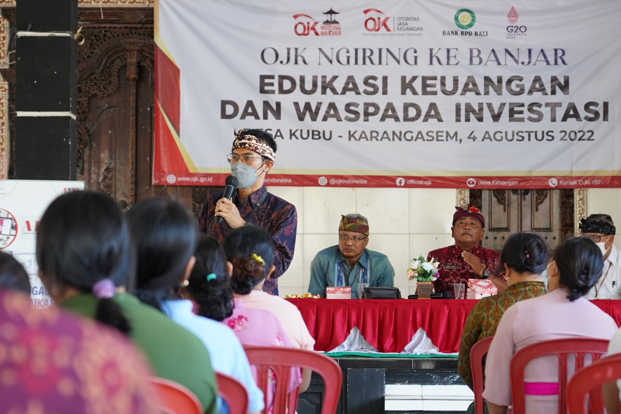 balitribune.co.id | Karangasem - OJK Regional 8 Bali dan Nusa Tenggara kembali melaksanakan rangkaian kegiatan sosialisasi terkait edukasi keuangan dan waspada investasi yang ditujukan kepada masyarakat di Desa Kubu, Kamis (4/8) dan Desa Tulamben, Kamis (5/8). Kegiatan edukasi ini merupakan program OJK Ngiring ke Banjar yang telah dilaksanakan sebanyak 10 kali sejak awal tahun 2022, dan yang pertama kali dilaksanakan di Kabupaten Karangasem.