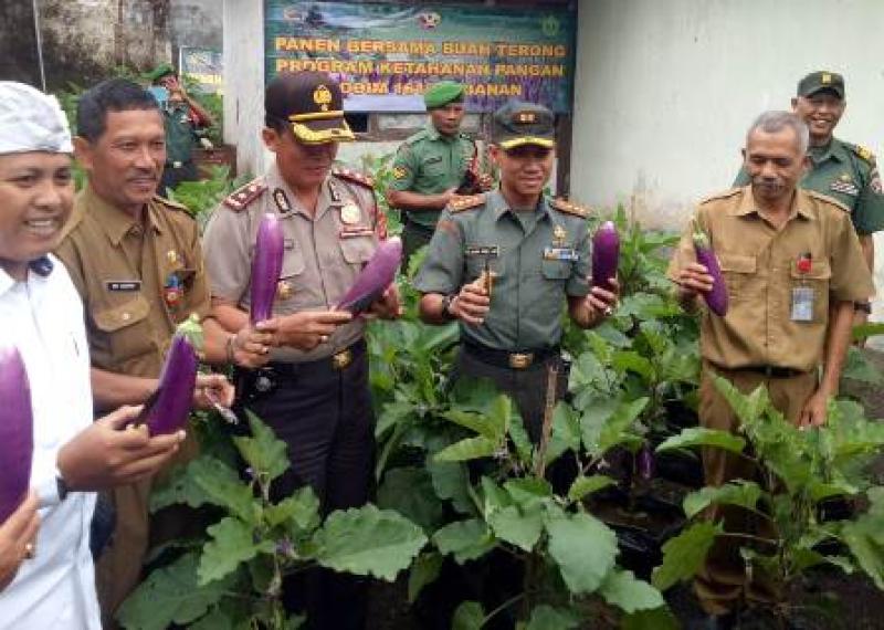 BALI TRIBUNE - Sebanyak 300 pohon terong yang ditanam di polibeg di halaman Kantor Koramil 07/Baturiti, Tabanan, dipanen, Senin (16/7). Panen terong sebagai wujud implementasi ketahanan pangan yang digagas Kodim 1619/Tabanan tersebut dihadiri  Dandim 1619/Tabanan. Dandim 1619/Tabanan Letkol Inf Abdullah Hasan mengucapkan puji syukur kepada Tuhan atas keberhasilan yang ditunjukkan dengan upaya membantu ketahanan pangan yang dilakukan anggota Kodim 1619/Tabanan. Kegiatan ini merupakan tuntutan perorangan maupun satuan di jjaran TNI AD yang diamanatkan dalam Undang-Undang nomor 34 tahun 2004 tentang  Operasi Militer Selain Perang (OMSP) Yaitu membantu tugas pemerintah di daerah melalui  fungsi utama pembinaan territorial. “Babinsa sebagai ujung tombak satkowil untuk terus bersama sama dengan rakyat mengatasi permasalahan yang ada di wilayah masing-masing termasuk di bidang pertanian dan melakukan pembinaan ketahanan pangan dengan memanfaatkan Sumber Daya Manusia (SDM) dan Sumber Daya Alam secara efektif, efisien, ramah lingkungan dan berkelanjutan,” jelasnya. Kegiatan tersebut juga dihadiri Muspika Kecamatan Baturiti, Dinas pertanian Kabupaten Tabanan,UPTD Kecamatan  Baturiti, beserta undangan lainnya. Hadir pula seluruh Danramil jajaran Kodim 1619/Tabanan dan Pasiterdim.