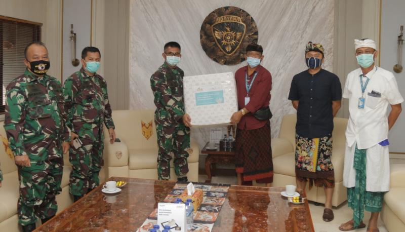 Saat itu, Kodam IX/Udayana menerima sumbangan 1.000 pcs masker dari GWK Bali untuk dibagikan kepada masyarakat guna mencegah dan melindungi diri sendiri dan orang lain terhadap penularan Covid-19. Bantuan masker dari management GWK Bali secara simbolis diserahkan I Nengah Widana (Security and Operations Officer), didampingi Harisal T (Corporate Affair Deputy Division) dan I Wayan Sudana (Staf) kepada Pangdam IX/Udayana.