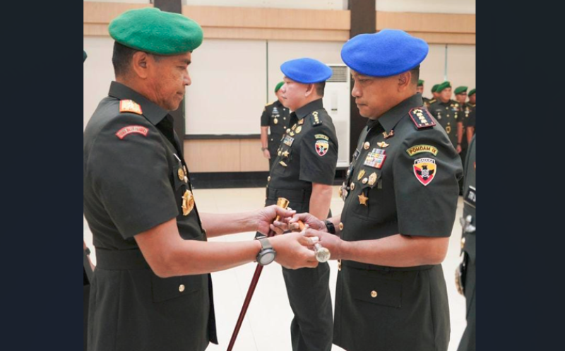 Bali Tribune/ Selain menerima Tradisi Laporan Korps Pejabat Kodam IX/Udayana, Pangdam IX/Udayana Mayjen TNI Harfendi (kiri) juga memimpin sertijab Danpomdam IX/Udayana di Aula Supardi Makodam IX/Udayana, Denpasar, Senin (28/8).