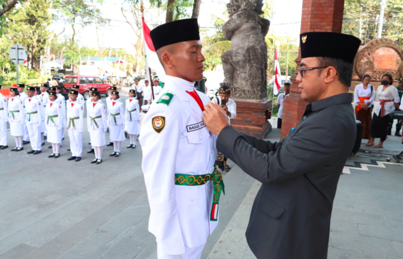 Bali Tribune/ PASKIBRAKA- Wali Kota Denpasar Jaya Negara mengukuhkan Pasukan Pengibar Bendera Pusaka (Paskibraka) Kota Denpasar pada Peringatan HUT Proklamasi Kemerdekaan ke-78 RI di halaman depan Gedung Dharma Negara Alaya Denpasar, Senin (14/8).