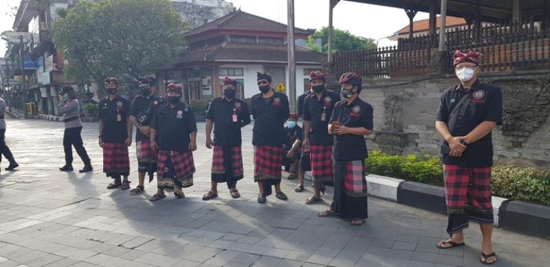 Bali Tribune/ Pecalang Desa Adat Semarapura saat mengamankan aksi demo AWK di Monument Puputan Klungkung.