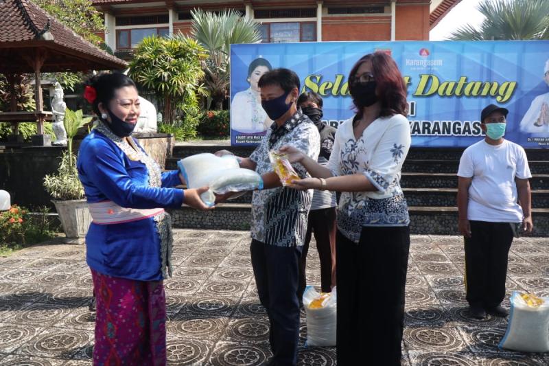 balitribune.co.id | Amlapura - Untuk meringankan beban masyarakat yang terdampak wabah Covid-19, Bupati Karangasem I Gusti Ayu Mas Sumatri membagikan paket sembako dari Dinas Sosial Kabupaten Karangasem, pengusaha Toko Bintang dan Bank BRI, Senin (21/4/2020). Bupati Mas Sumatri dalam kesempatan itu menyampaikan terimakasih kepada seluruh pihak yang ikut membantu meringankan beban ekonomi masyarakat Karangasem yang terdampak Covid-19.