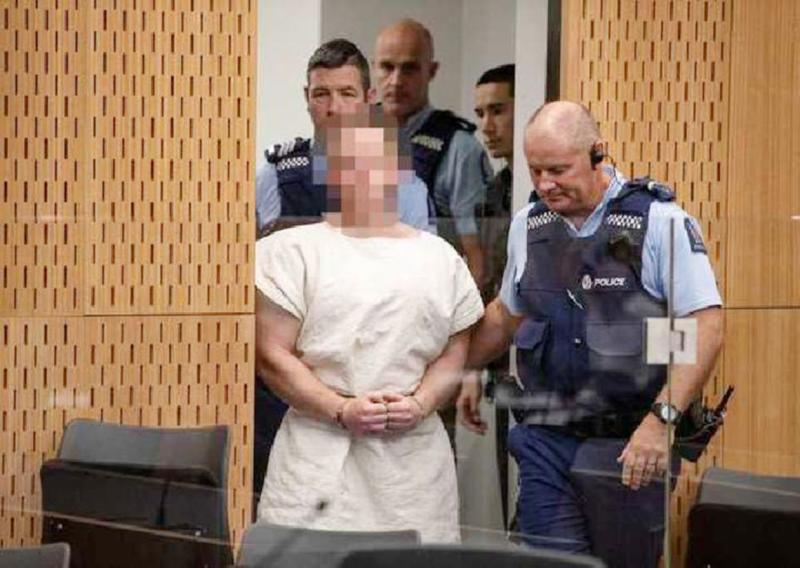 Tarrant, dihadirkan polisi di ruang sidang dalam keadaan kedua tangan terborgol dan hanya diam dalam persidangan perdana yang berlangsung singkat.