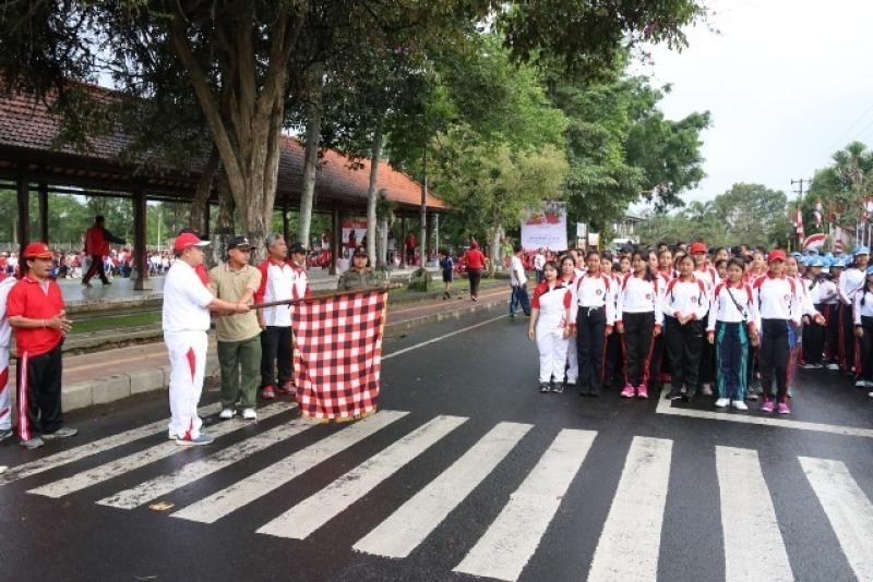 LEPAS - Sekda Bangli IB Giri Putra melepass jalan santai bernuanasa merah putih, serangkaian Hari Ulang Tahun (HUT) RI ke-73 di Kabupaten Bangli.