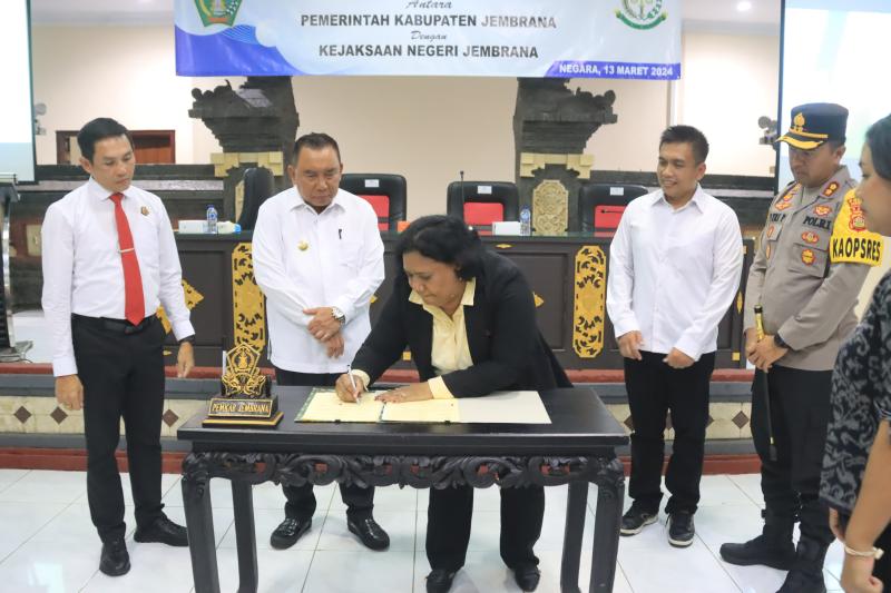 Balitribune.co.id | Negara - Pemerintah Kabupaten Jembrana kembali melakukan penandatanganan Memorandum of Understanding (MoU) dengan Kejaksaan Negeri Jembrana. Kesepahaman ini dalam hal pendampingan hukum perdata dan tata usaha negara (TUN). Penandatanganan dilaksanakan, Rabu (13/3/2024), di Aula Lantai 2 Jimbarwana Kantor Bupati Jembrana.