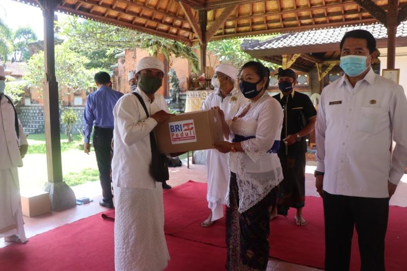 Bupati Karangasem IGA Mas Sumatri didampingi Pj Sekda I Gede Darmawa, Ketua PHDI, Ketua WHDI, Ketua Jro Mangku dan Kabag Kesra menyerahkan paket sembako ini secara simbolis di Puri Gede pada Rabu (13/5/2020).