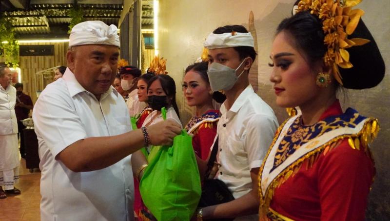 Bali Tribune / BANTUAN - Bupati Tamba menyerahkan bantuan sembako kepada 50 anak-anak kurang mampu yang dididik dan dibina seni tari dan gong di Maitreya Center.