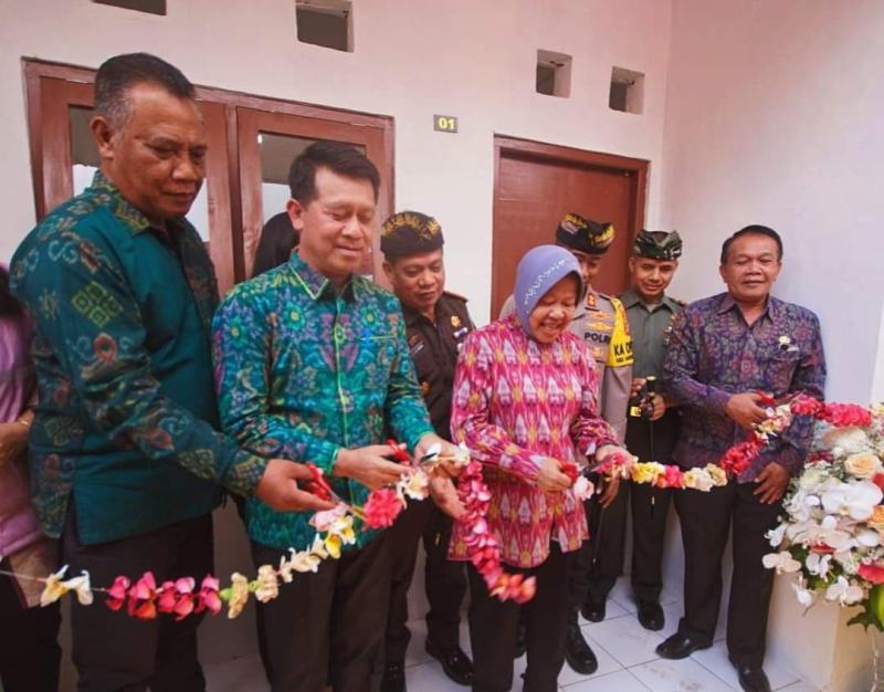balitribune.co.id | Semarapura - Jangan terlena dan manja di tempat ini, bapak dan ibu harus semangat untuk bangkit dan keluar dari zona kemiskinan serta rawat rumah ini dengan baik. Itulah pesan Bupati Klungkung I Nyoman Suwirta kepada 36 KK Miskin saat mendampingi Menteri Sosial Republik Indonesia Ibu Tri Rismaharini meresmikan Rumah Deret bagi masyarakat Tuna Wisma bertempat di Desa Sulang Kecamatan Dawan Kabupaten Klungkung, Senin (23/10/2023).