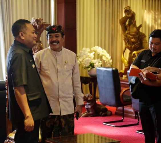 balitribune.co.id | Semarapura - Wakil Bupati Klungkung I Made Kasta yang juga sekaligus sebagai Pengelingsir Pasemetonan Pangeran Tangkas Kori Agung menemui Bupati Gianyar I Made Agus Mahayastra diruang kerjanya Kantor Bupati Gianyar, Selasa (1/11/2022).