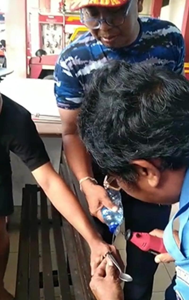 Kasi Penyelamatan dan Pemadaman Kebakaran Klungkung, I Gede Erwan Supriantana, menjelaskan bahwa kondisi jari korban sudah mulai mengalami tekanan akibat lingkaran cincin yang terlalu ketat. Petugas pun harus menggunakan alat gerinda mini untuk memotong material logam alpaka tersebut.