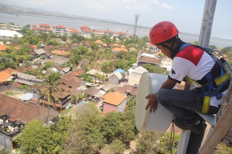 Teknisi PT. XL Axiata (XL Axiata) sedang melakukan pemeriksaan terhadap perangkat telekomunikasi di salah satu BTS di Tanjung Benoa, Kuta Selatan, Badung, Jumat (5/10).