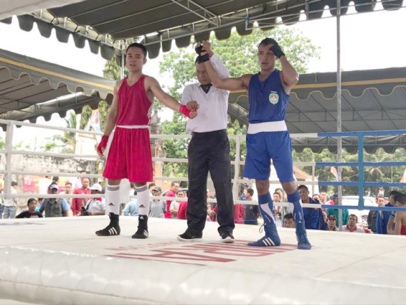KEJURNAS - Petinju Denpasar Gregorius di kelas welter ringan 64 kg (kanan) saat meraih medali emas di ajang Porprov Bali XIII di Gianyar. Prestasi itu mengantarkannya menjejak ring tinju kejurnas di Babel.