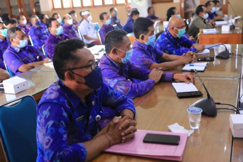 balitribune.co.id | Semarapura - Bupati Klungkung I Nyoman Suwirta memimpin Rapat Staf Lengkap Mengenai Bela Pengadaan Perencanaan Pembangunan Daerah Tahun 2023 di ruang rapat Praja Mandala, Kantor Bupati Klungkung, Selasa (29/3/2022). Turut hadir Sekretaris Daerah Kabupaten Klungkung I Gede Putu Winastra serta Kepala OPD di lingkungan Pemerintah Kabupaten Klungkung.
