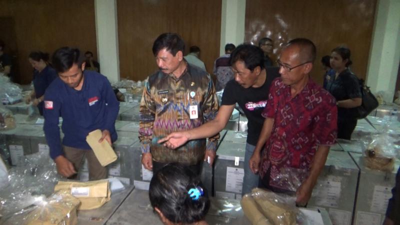 TINJAU - Pj Bupati Gianyar I Ketut Rochineng meninjau kesiapan logistik Pilkada Serentak 2018.