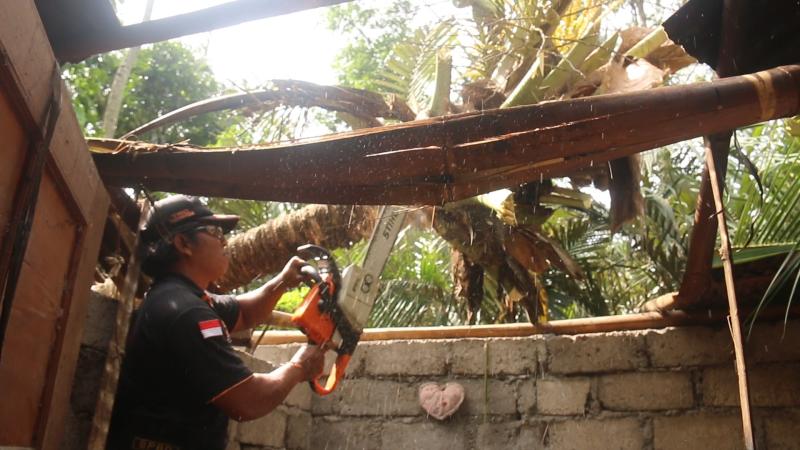 Usai melakukan penanganan di Desa Jungutan, Bebandem, tim lanjut bergerak menuju Banjar Dinas Perang Sari Tengah, Desa Duda Utara, Kecamatan Selat, untuk mengevakuasi batang pohon kelapa yang menghacurkan rumah milik warga I Komang Subadiasa.