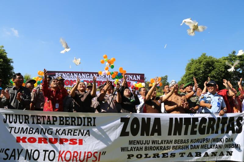 Bali Tribune, Tabanan - Dalam mewujudkan pelayanan yang lebih baik, Polres Tabanan menggelar Pencanangan Pembangunan Zona Integritas Menuju Wilayah Bebas Korupsi (WBK) dan Wilayah Birokrasi Bersih dan Melayani (WBBM), di halaman depan kantor setempat, Selasa (26/2). Giat ini ditandai penandatanganan spanduk zona integritas dan pelepasan burung merpati juga balon ke udara. Hadir pada kesempatan tersebut, Bupati Tabanan Ni Putu Eka Wiryastuti, Kepala Ombudsman Perwakilan Bali, Oemar Ibnu Alkhatab, Forkompinda Kabupaten Tabanan, di antaranya Kapolres Tabanan, AKBP Made Sinar Subawa, Kajari Tabanan Ni Wayan Sinaryati, Ketua PN, Made Sukereni, Perwakilan Dandim 1619 Tabanan, Perwakilan Lapas Tabanan, Ketua FKUB Tabanan, I Wayan Tontra, Sekda Tabanan, I Gede Susila, dan OPD terkait di lingkungan Pemkab Tabanan. “Terwujudnya pelayanan prima kepolisian di dalam melayani masyarakat, khususnya masyarakat Tabanan adalah cita-cita Polres Tabanan. Sebagaimana diamanatkan Undang-Undang Kepolisian yaitu sebagai pelayan, pelindung, dan pengayom masyarakat. Hal ini dapat terwujud ketika ada komitmen yang baik dari seluruh komponen, baik yang dimiliki Polres ataupun masyarakat Tabanan,” jelas AKBP Made Sinar Subawa. Ditambahkan Sinar Subawa, Polres Tabanan telah membangun dan membuat ruang-ruang publik, ruang-ruang pelayanan menjadi sebuah ruang yang bisa dinikmati masyarakat, yang membutuhkan pelayanan. Terutama pada tiga sisi, yaitu; aspek keamanan khususnya kriminalitas, pelayanan SKCK, Pelayanan SIM, Samsat dan BPKB. Selain itu Polres Tabanan juga membangun ruang pelayanan masyarakat saat hari libur. “Selain jam kerja, kami juga memberikan pelayanan di hari libur melalui program kami, yakni Bale Bengong Corner Weekend. Mereka bisa mendapatkan pelayanan pada tiga sisi tersebut. Inilah suatu terobosan kami, meskipun bermalam minggu, masyarakat masih bisa mengurus kelengkapan surat-surat dari Kepolisian,” bebernya. Dirinya menyadari, tanpa kerja sama semua pihak, baik dari Polres Tabanan dan masyarakat tidak akan bisa mewujudkan hal tersebut. Oleh karena itu, ia mengajak seluruh personel Polres Tabanan agar melayani masyarakat dengan jujur dan transparan, juga masyarakat secara sadar mengikuti setiap tahapan dalam sistem yang sudah dibuat, disiapkan serta berkomitmen untuk tidak memberikan kontribusi pada penyimpangan yang dilakukan oleh personel kepolisian, mencari calo dan lain sebagainya. “Terwujudnya pembangunan Zona Integritas ini tidak hanya berhenti pada satu titik, namun berproses ketika kita berbuat dan melakukan pekerjaan walaupun tidak sempurna tetapi kami tetap berusaha berdiri diatas kejujuran untuk menjadi baik. Salam jujur tetap berdiri, tumbang karena korupsi, jangan biarkan korupsi menghancurkan Negeri ini. Say No to Korupsi,” tegasnya. Sementara Bupati Eka mengapresiasi langkah-langkah yang telah diupayakan Polres Tabanan dalam mewujudkan WBK dan WBBM. Bupati Eka menjelaskan dalam pencegahan dan pemberantasan korupsi merupakan tanggung jawab kita bersama untuk mewujudkan pemerintahan yang bersih.