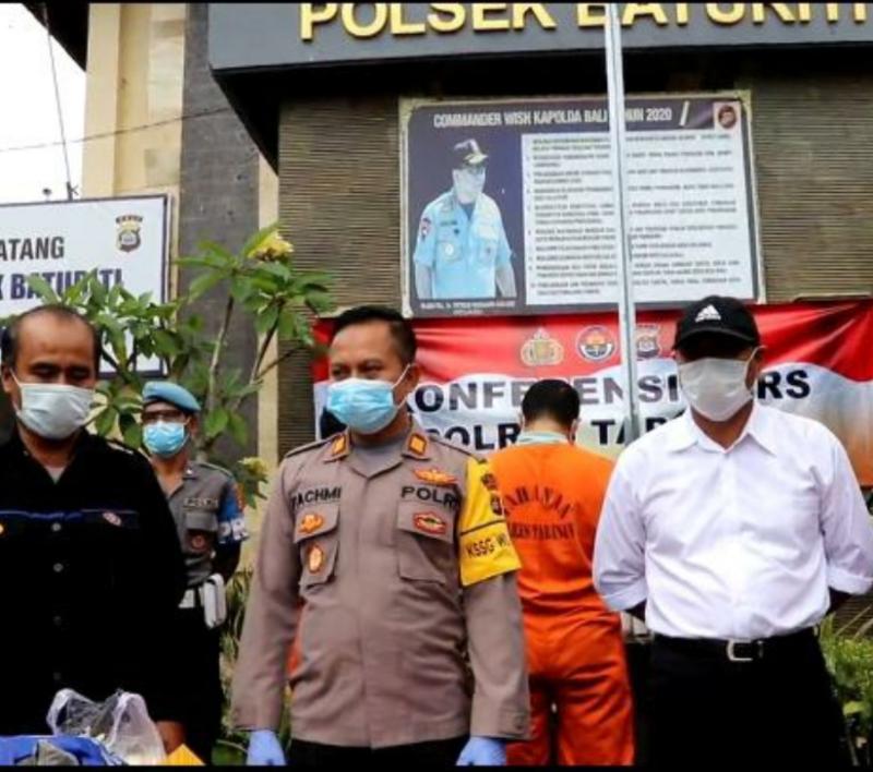 Balitribune.co.id | Tabanan - Seijin Kapolres Tabanan AKBP Mariochristy P.S. Siregar, S.I.K., M.H., pada hari Senin 9 Nopember 2020 Siang, Kapolsek Baturiti AKP Fachmi Hamdani, S.Psi, S.I.K., didampingi Waka Polsek, Kanit Reskrim dan Kasubbag Humas Polres Tabanan Iptu I Nyoman Subagio, S.Sos, menggelar Press Release bertempat di Polsek Baturiti terkait pengungkapan kasus congkel kotak uang sesari di Pura.