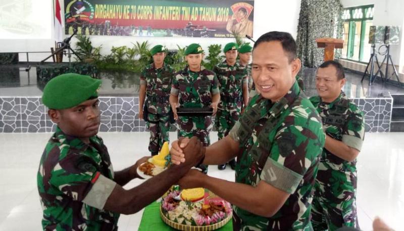 INFANTERI -- Didampingi Danyonif 742/SWY Letkol Inf Agus Doni, para Dandim dan Kasi, Danrem 162/Wira Bhakti Kolonel Czi Ahmad Rizal Ramdahani (kanan) menyerahkan potongan tumpeng syukuran Hari Lahir ke-70 Korps Infanteri, kepada prajurit termuda Prada Yuliaus Rupampam.