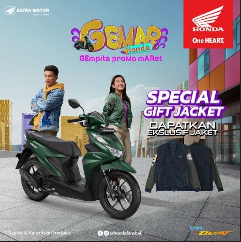 Astra Motor Bali menyiapkan Special Gift berupa jaket ekslusive yang dapat diterima langsung oleh konsumen Honda di area Bali. Melalui program ini, setiap pembelian secara cash maupun kredit, konsumen berkesempatan mendapatkan promo direct gift jaket ekslusive untuk setiap pembelian Honda BeAT Sporty.