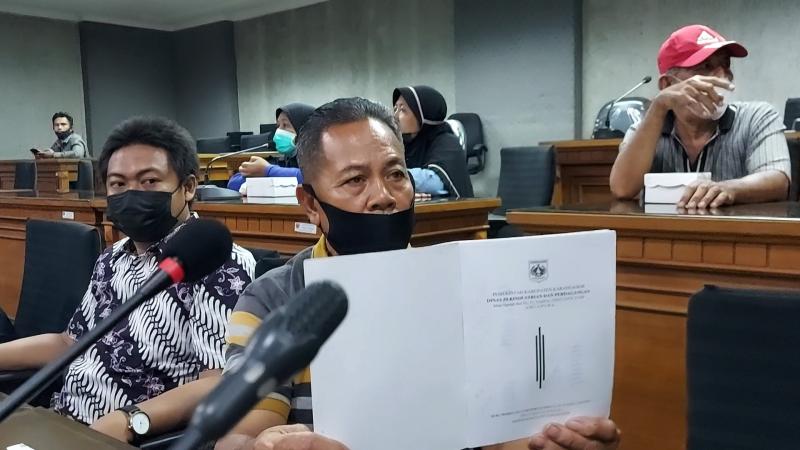 Bali Tribune / TUNJUKKAN BUKTI - Salah satu perwakilan pedagang menunjukan bukti pungutan retribusi pemerintah.