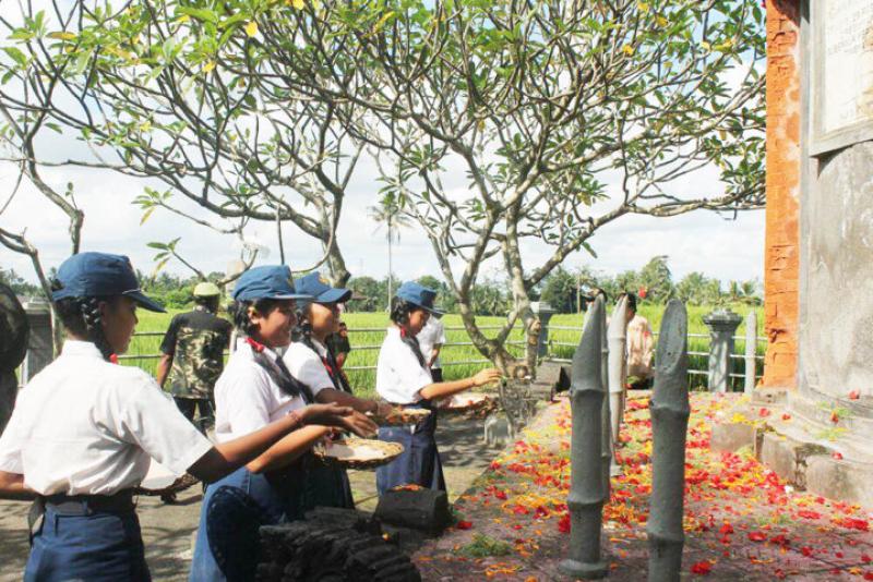 TABUR BUNGA - Peringatan Perang Pejeng ke-72 yang berjalan khidmat, Rabu (28/2). Di Tugu Pahlawan Sapta Dharma Pejeng, diisi dengan penghormatan serta tabur bunga.