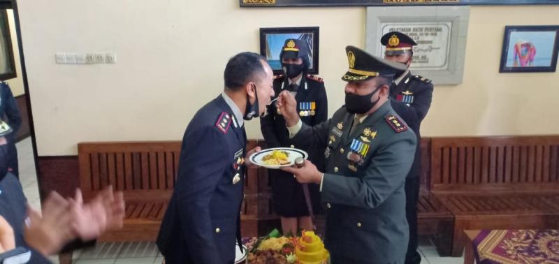 Bali Tribune/ PERSAHABATAN - Dandim 1617/Jembrana Letkol Jefri Marsono Hanok suapan persahabatan ke Kapolres Jembrana AKBP I Ketut Gede Adi Wibawa.