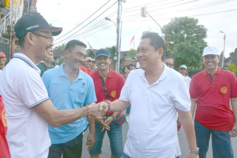 JALAN SANTAI - Walikota Denpasar, IB Rai Dharmawijaya Mantra melepas jalan santai yang digelar Warga Banjar Bengkel Kecamatan Denpasar Timur, Minggu (13/8).