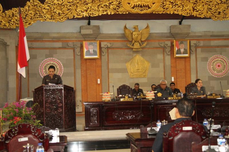 BALI TRIBUNE - Bupati Tabanan Ni Putu Eka Wiryastuti menyampaikan pidato pengantar  2 Rancangan Peraturan Daerah (Ranperda) Kabupaten Tabanan dalam Rapat Paripurna DPRD setempat. Berlangsung di Ruang Rapat Kantor DPRD Tabanan, Selasa (9/10) kemarin, kedua Raperda dimaksud adalah, Ranperda tentang anggaran pendapatan dan belanja daerah tahun anggaran 2019 dan Ranperda tentang penambahan penyertaan modal pemerintah kabupaten Tabanan pada P.T Penjaminan Kredit Daerah Bali Mandara Provinsi Bali.  Pada sidang yang dipimpin Ketua DPRD Tabanan I Ketut Suryadi itu, BUpati Eka dalam pidato pengantarnya mengatakan, Anggaran Daerah yang merupakan informasi publik adalah cerminan kebijakan daerah yang dituangkan dalam bentuk program dan kegiatan yang diarahkan untuk peningkatan kualitas pelayanan publik dan kesejahteraan masyarakat. “Oleh karena itu kita semua wajib berkomitmen agar pelaksanaannya dapat dilakukan secara efektif dan efisien,” tegasnya. Dia menyebutkan, hal penting lainnya yang tidak dapat dikesampingkan dalam upaya meningkatkan kesejahteraan rakyat adalah perlu dukungan berbagai kebijakan sehingga pada gilirannya tercipta peluang yang dapat mengarah pada perbaikan dan peningkatan kesempatan dalam memperoleh pendapatan serta peluang untuk berpartisipasi dalam pembangunan.  "Apabila kita dapat mengarahkan kebijakan yang tepat dalam ABBD sehingga mendorong upaya untuk penanggulangan kemiskinan, meningkatkan kualitas SDM, penciptaan stabilitas ekonomi dan keuangan serta perluasab tempat kerja, maka akan tumbuh gerakan pembangunan yang sinergis dari pihak yaitu pemerintah, dunia usaha dan masyarakat," lanjut Bupati Eka.  Sebelumnya dijelaskan dalam Rancangan APBD Kabupaten Tabanan Tahun Anggaran 2019, Pendapatan Daerah direncanakan sebesar Rp 1,850 trilyun lebih mengalami menurunan sebesar Rp 40,847 milyar lebih atau 2,16 persen dari anggaran induk tahun 2018 sebesar Rp 1,891 trilyun lebih. Belanja daerah direncanakan sebesar Rp 1,868 trilyun lebih mengalami penurunan sebesar Rp 256,847 milyar. Sehingga terdapat defisit sebesar Rp 19,520milyar yang akan ditutup dari pembiyaan netto, dimana netto tersebut dirancang bersumber dari estimasi silpa tahun anggaran 2018.  Sedangkan mengenai Ranperda tentang penambahan penyertaan modal Pemerintah Kabupaten Tabanan pada P.T Penjaminan Kredit Daerah Bali Mandara Provinsi Bali merupakan upaya daerah untuk meningkatkan efisiensi , produktivitas dan efektivitas pemanfaatan sumber dana yang ada dalam rangka pemberdayaan ekomomi masyarakat.  "Demikian kata pengantar yang dapat saya sampaikan. Untuk mendapatkan suatu hasil yang optinal kami mengharapkan saran serta masukan dari para anggota dewan yang terhormat, di dalam upaya kita bersama meningkatkan pemberdayaan masyarakat, kegiatan sosial kemasyarakatan serta peningkatan kualitas pelayanan publik menuju terwujudnya Tabanan yang sejahtera aman dan berprestasi, “tutupnya.