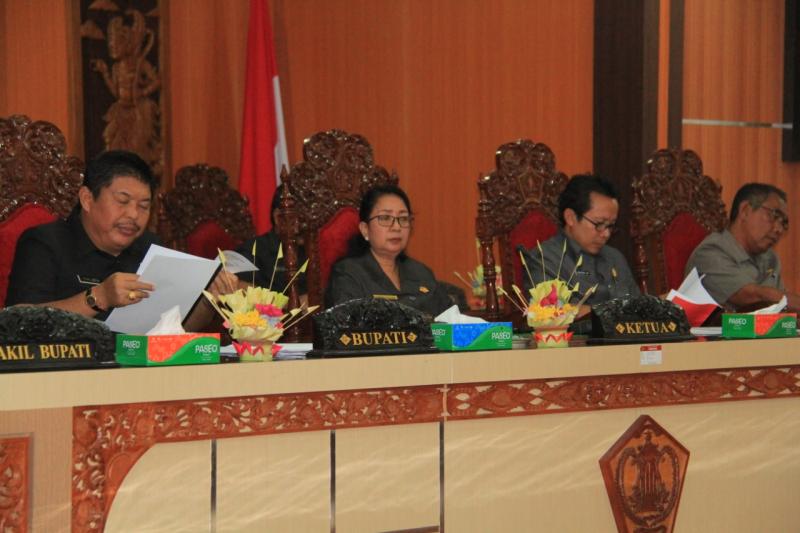 Rapat Paripurna dipimpin Ketua DPRD Jembrana, I Made Sri Shutarmi. Tiga perda yang diambil keputusan dalam Rapat Paripurna Jumat kemarin yakni Ranperda tentang Anggaran Pendapatan dan Belanja Daerah (APBD) Tahun Anggaran 2020 dan Ranperda tentang Pembentukan Perangkat Daerah Badan Kesatuan Bangsa dan Politik (Kesbangpol) usul Bupati serta Ranperda tentang Pengelolaan Barang Milik Daerah inisiatif DPRD.