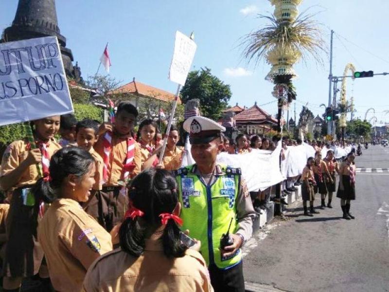 Nyatanya, ratusan siswa SMPN 1 Semarapura Jumat (27/4) sedang melakukan demo dan menyambangi Kantor Diskominfo, Klungkung. Dengan penuh semangat dan gegap gempita mereka kompak seraya mengangkat tangannya tinggi-tinggi dengan teriakan lantang namun masih tertib.  Mereka kompak semua meneriakkan secara lantang agar situs pornografi yang marak di media sosial segera ditutup.