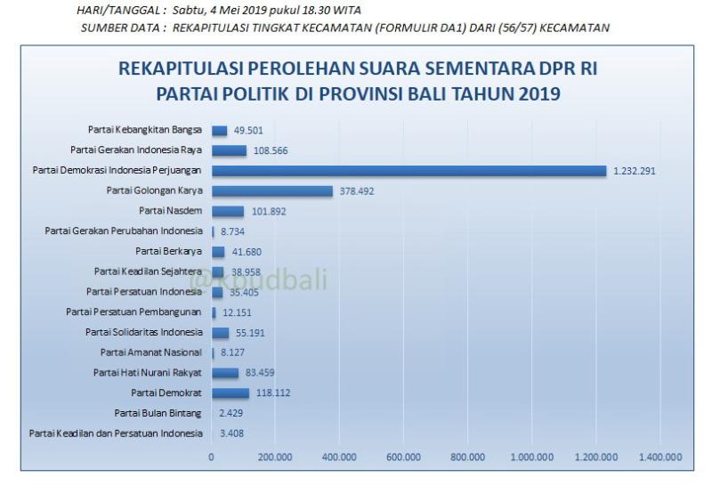 balitribune.co.id | Denpasar -  Dari total 57 kecamatan di Bali, rekapitulasi penghitungan suara Pemilu 2019 untuk 56 kecamatan sudah masuk tabulasi data KPU Provinsi Bali, Sabtu (4/5). Dari total suara untuk 56 kecamatan tersebut, hanya tiga partai yang mampu mengutus wakilnya ke Senayan dari Dapil Bali.