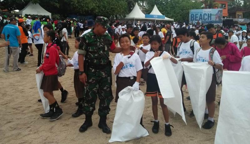 BERSIH -- Mendukung program “Gerakan Indonesia Bersih” dan jelang perhelatan “OCC 2018”, prajurit TNI bersinergi dengan instansi terkait serta mengajak sejumlah pelajar dan mahasiswa untuk membersihkan lingkungan di sekitar kawasan pantai di Bali.