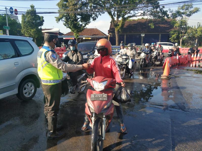 balitribune.co.id | Mangupura - Satlantas Polres Badung yang dipimpin langsung Kasat Lantas Akp Aan Saputra, SIK, MH, membagikan masker ke pengendara kendaraan  selain melaksanakan imbauan protokol kesehatan (Prokes) terhadap masyarakat, di Pos Penyekatan jalan Raya Mengwitani, tepatnya pintu Masuk Terminal Mengwi, Kabupaten Badung, Bali. Senin, (16/8) pagi 07.30 wita.