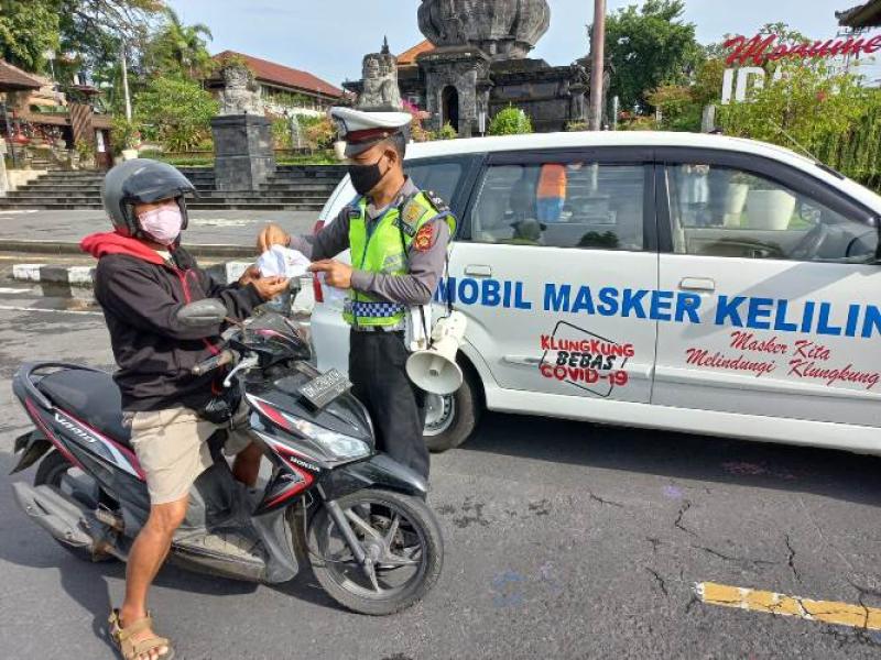 Sat Lantas Polres Klungkung membagikan masker yang ditujukan kepada para pengguna jalan yang melintas dan tidak menggunakan masker. “Kegiatan kita pagi ini, yakni memberikan edukasi protokol kesehatan Covid-19 sesuai anjuran pemerintah dan pembagian masker kepada masyarakat pengguna jalan yang tidak menggunakan masker,” tutur Kabag Ops Polres Klungkung Kompol I Nyoman Karang Adi Putra, S.H.