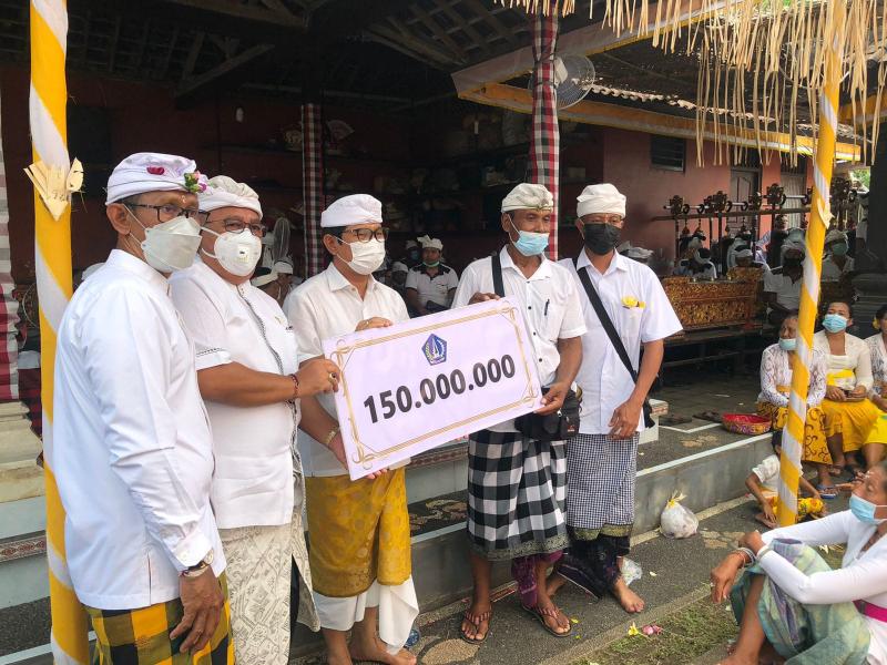 Dalam kesempatan tersebut Sekda Adi Arnawa melaksanakan persembahyangan bersama dan sebagai wujud bhakti Pemkab Badung Adi Arnawa serahkan bantuan dana secara simbolis sebesar Rp 150 juta.